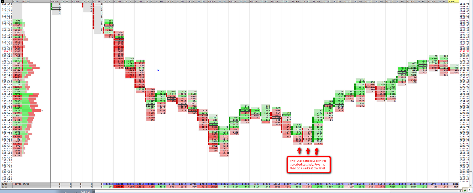 Here we have the example of a Brick Wall Pattern. Professional traders absorbed all the selling by covering their shorts or by buying the panick selling. 3 bars in a row reflected this pattern.